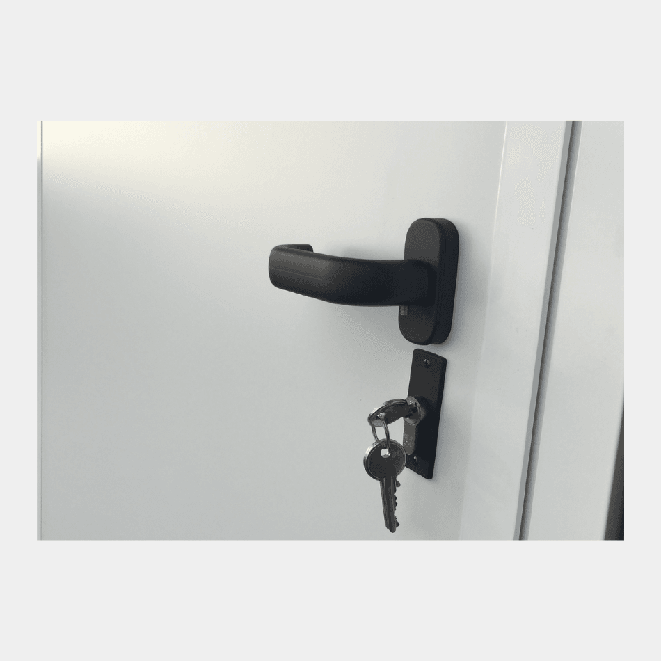 Deze nette aluminium dubbele loopdeur is eenvoudig te plaatsen in sandwichpanelen, containers of betonwanden. Het deurblad is gevuld met isolerend EPS-schuim en afgewerkt met een stevig kader. Ideaal voor industriële en agrarische toepassingen.