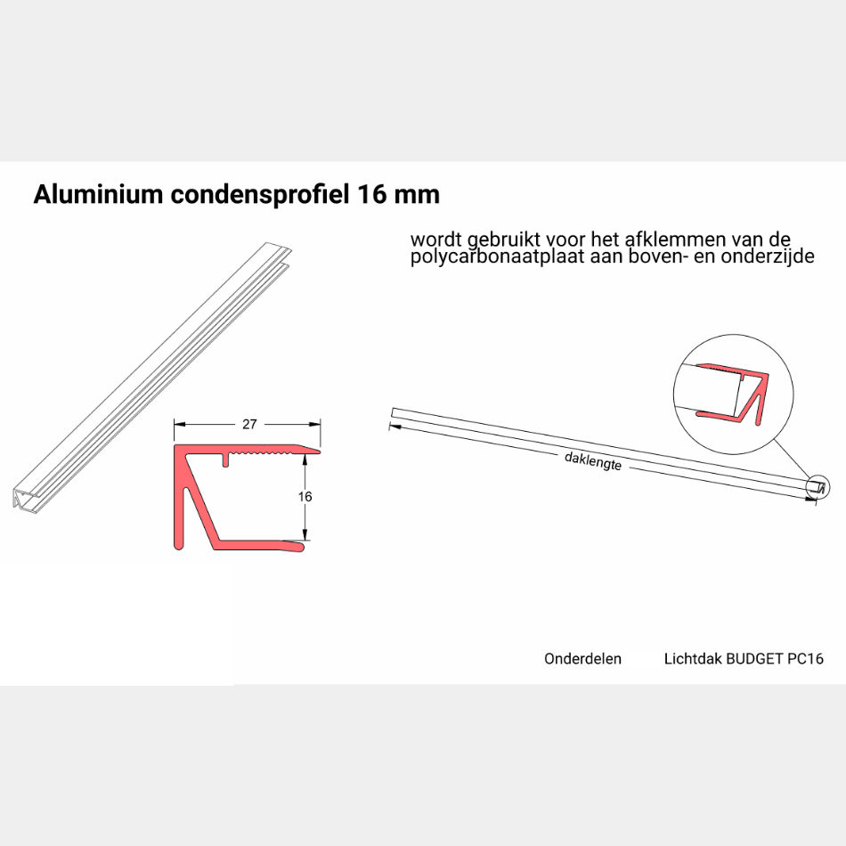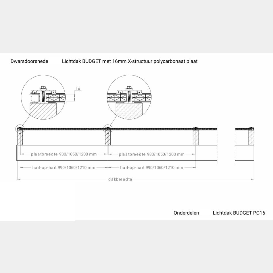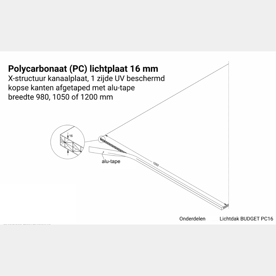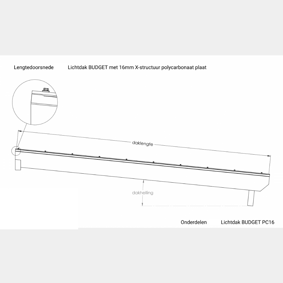 Het Lichtdak Budget 16mm is een betaalbare oplossing voor lichtdoorlatende overkappingen. Deze uitvoering met 16mm polycarbonaat kanaalplaten biedt basisbescherming tegen weersinvloeden, UV-straling en zonlicht. Ideaal voor toepassingen waar zelfdragend vermogen minder belangrijk is. Het pakket bevat alle essentiële onderdelen voor eenvoudige montage op een bestaande constructie met een minimale helling van 10°.