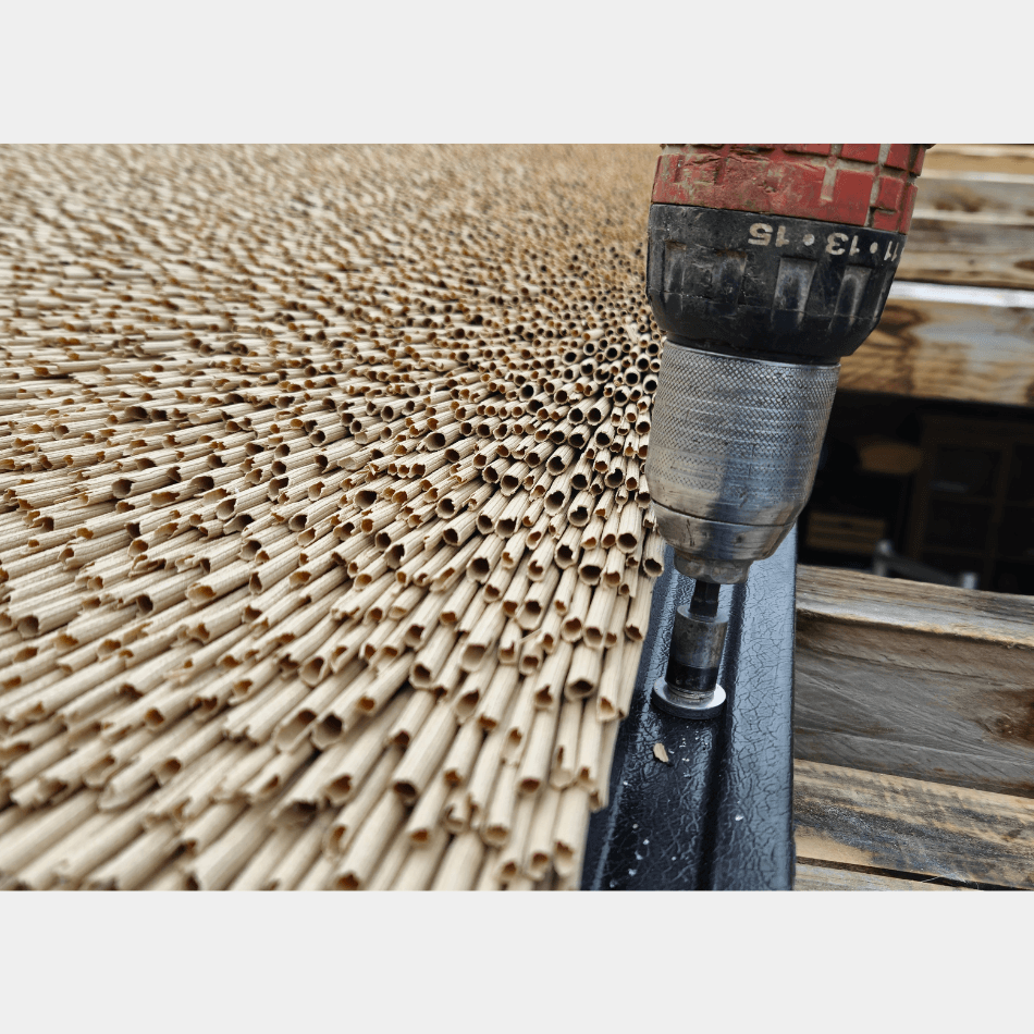 Het riet is gemaakt van hoogwaardig, brandwerend composiet met cellulose, dat de kleur en structuur van echt riet natuurgetrouw nabootst. Het materiaal is vormvast, onderhoudsvrij, volledig recyclebaar en beschikbaar in twee varianten: NEW Look (licht) en OLD Look (donker). Zo combineert het de uitstraling van natuurriet met de duurzaamheid en veiligheid van moderne technologie.