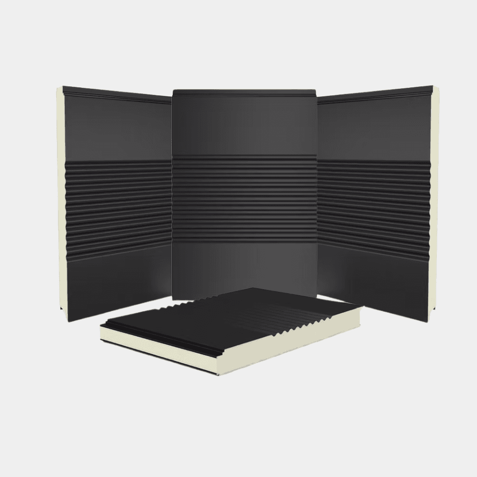 Dit gevel sandwichpaneel met een gedeelte Sinus en vlakke profilering en een verborgen bevestiging combineert een strakke uitstraling met uitstekende thermische isolatie. Dankzij de gecoate buitenplaat is het paneel extra duurzaam en corrosiebestendig. Beschikbaar vanaf 200m².