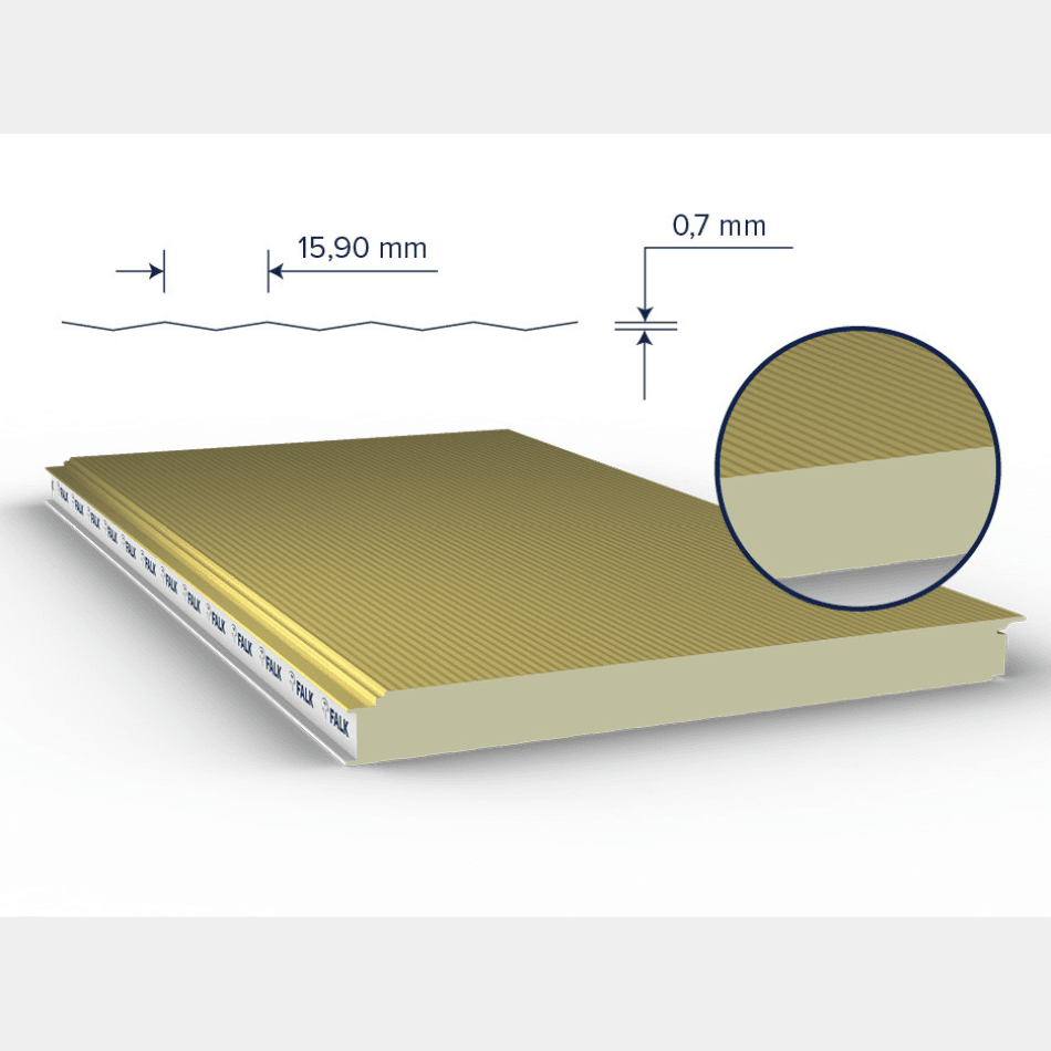 Het Sandwichpaneel Gevel Microrib 16 VB PIR FALK is een geïsoleerd sandwichpaneel voor verticale of horizontale geveltoepassingen. Met een Microrib profilering aan de buitenzijde combineert dit paneel een strakke uitstraling met uitstekende thermische prestaties. De PIR-isolatiekern zorgt voor een hoge isolatiewaarde. Ideaal voor tuinhuizen, bedrijfsgebouwen, hallen, loodsen en agrarische toepassingen.